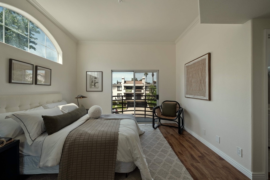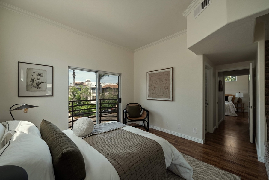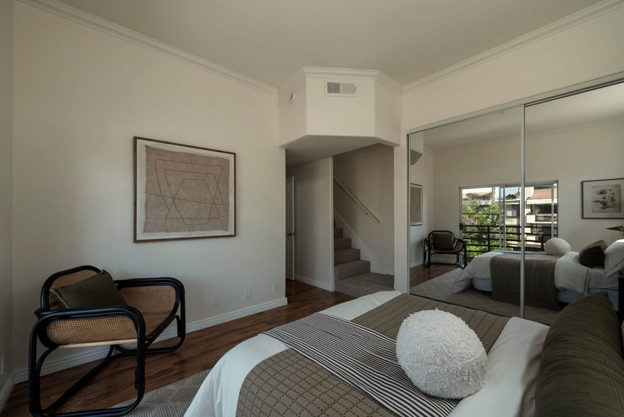 The kitchen at 4310 Whitsett Ave Unit 1 is practical and charming, with glass-front cabinets and a kitchen window that keeps the prep area bright. Upstairs, the primary retreat is a minimalist’s dream, but the real secret is the secondary staircase leading to a private rooftop-style patio. This is your space entirely—morning coffee in your pajamas or golden hour with a glass of wine.
