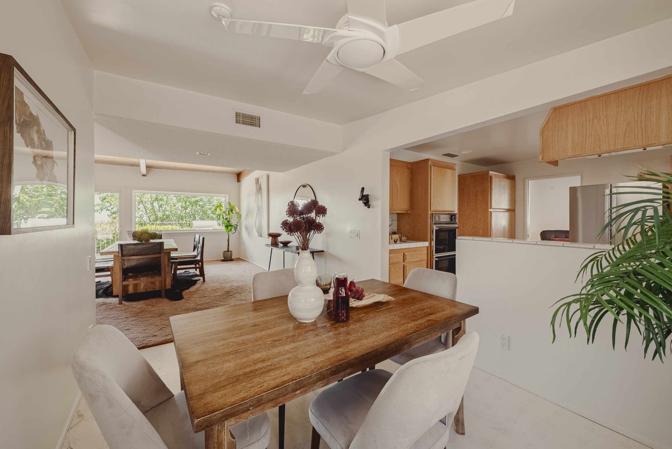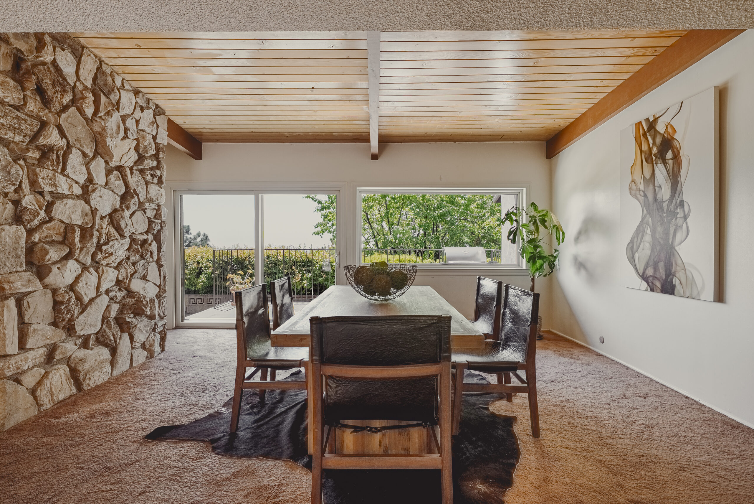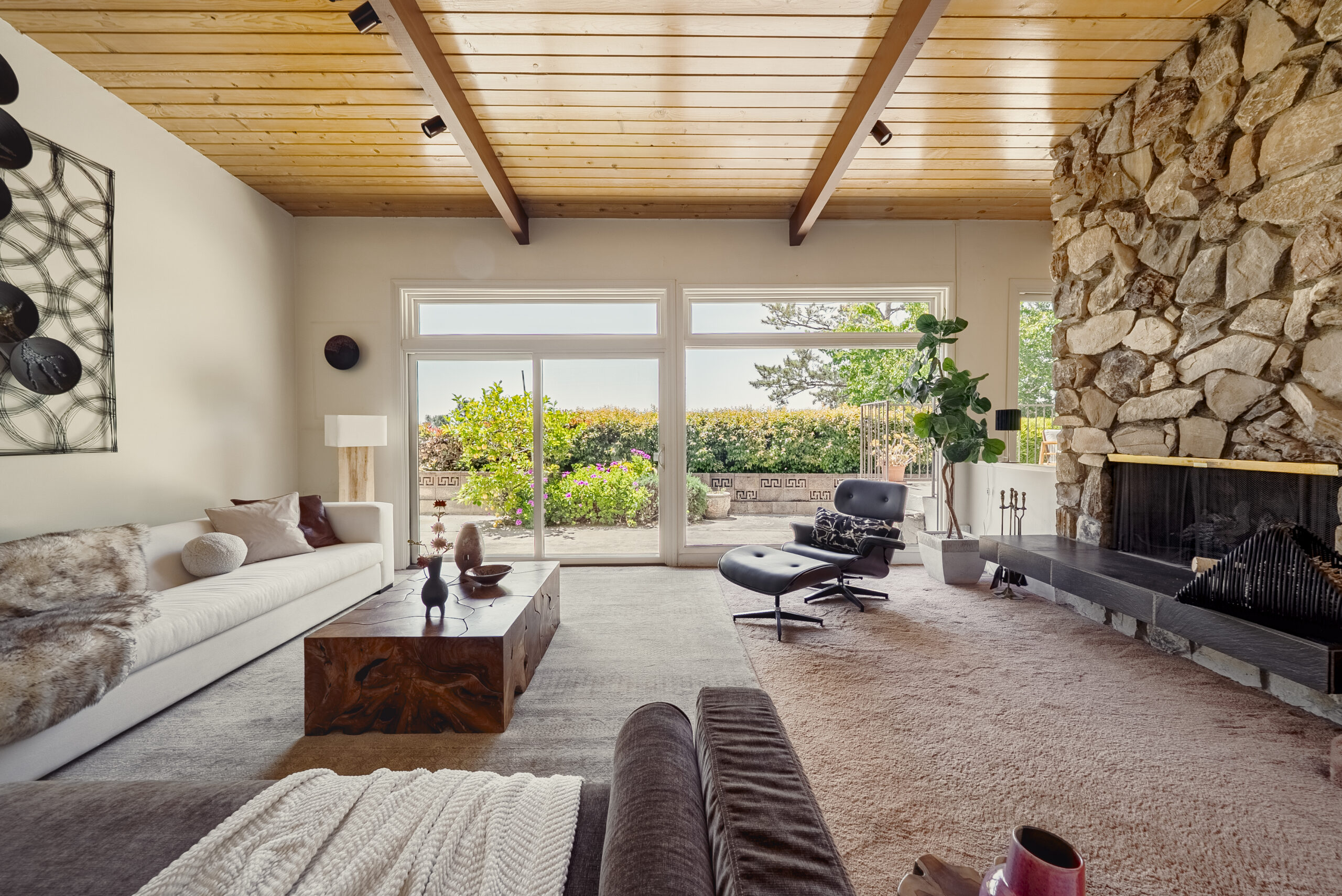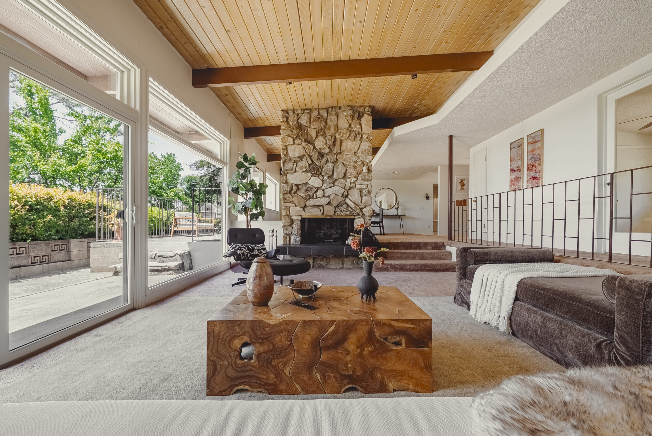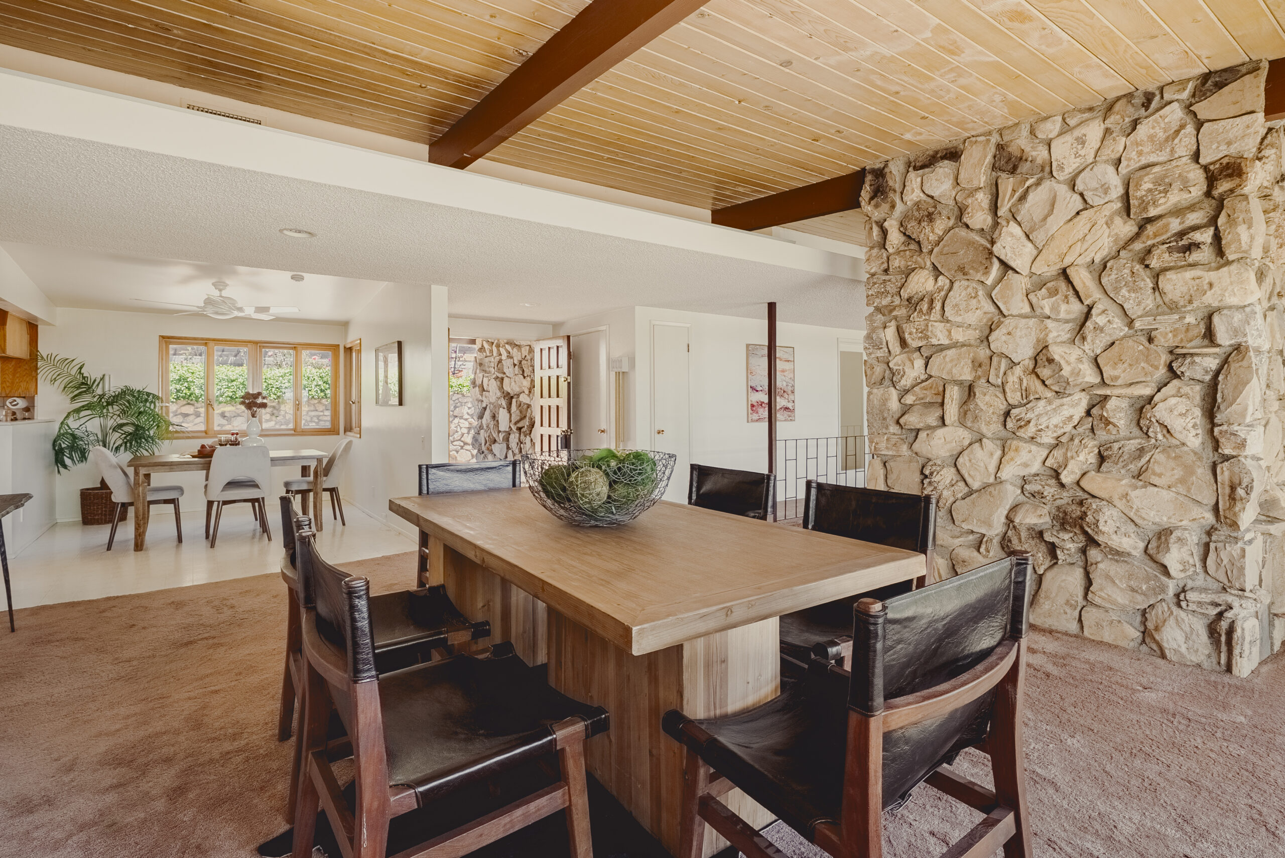 Step inside to just over 2,100 square feet of living space featuring three bedrooms plus a versatile office or potential fourth bedroom. A step-down living room adds a dash of mid-century modern charm, while vaulted, open-beam ceilings in both the living and dining rooms enhance the sense of light and airiness. The expanded kitchen offers a great connection to the breakfast area and flows seamlessly into the home’s main living spaces—perfect for entertaining or everyday comfort.