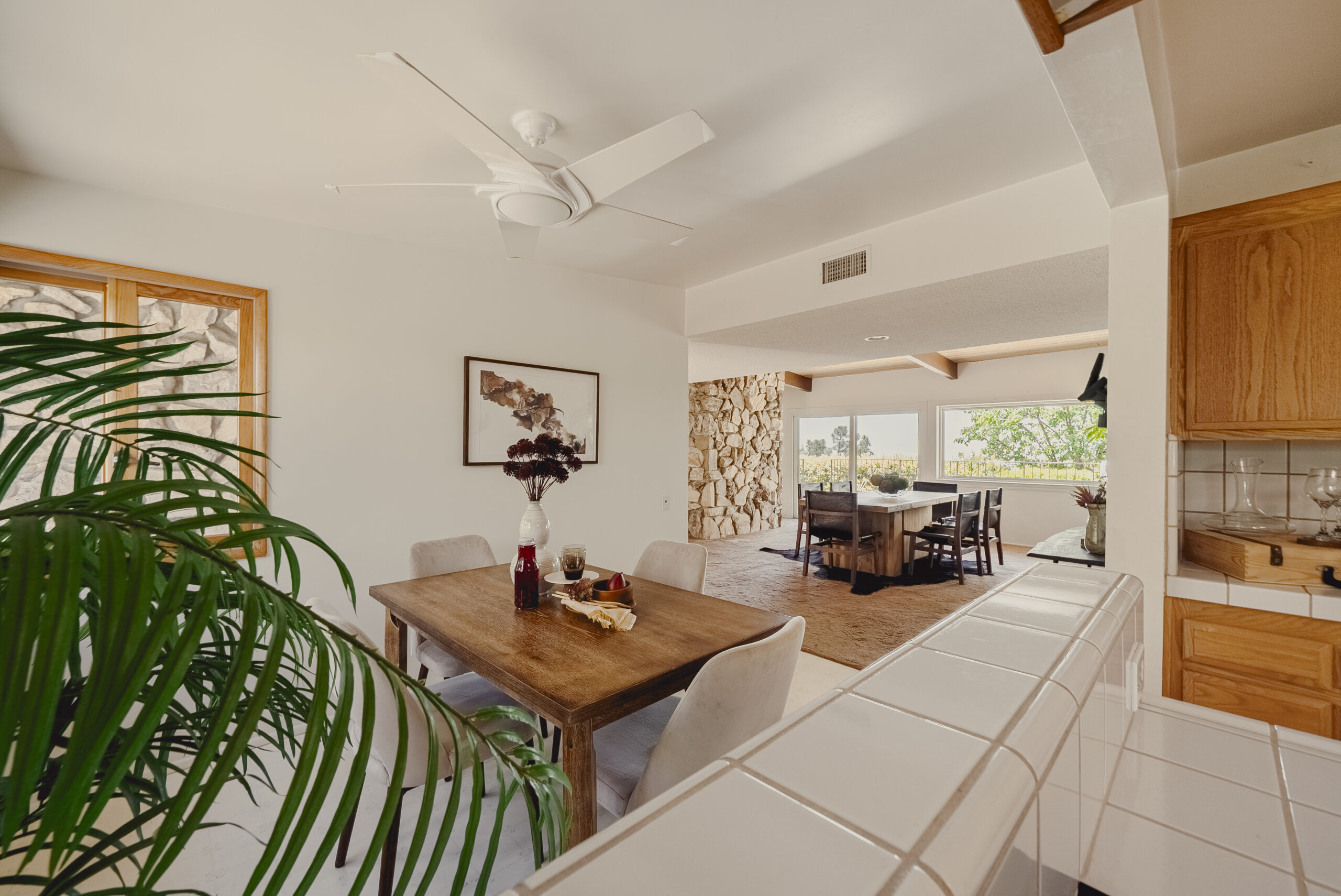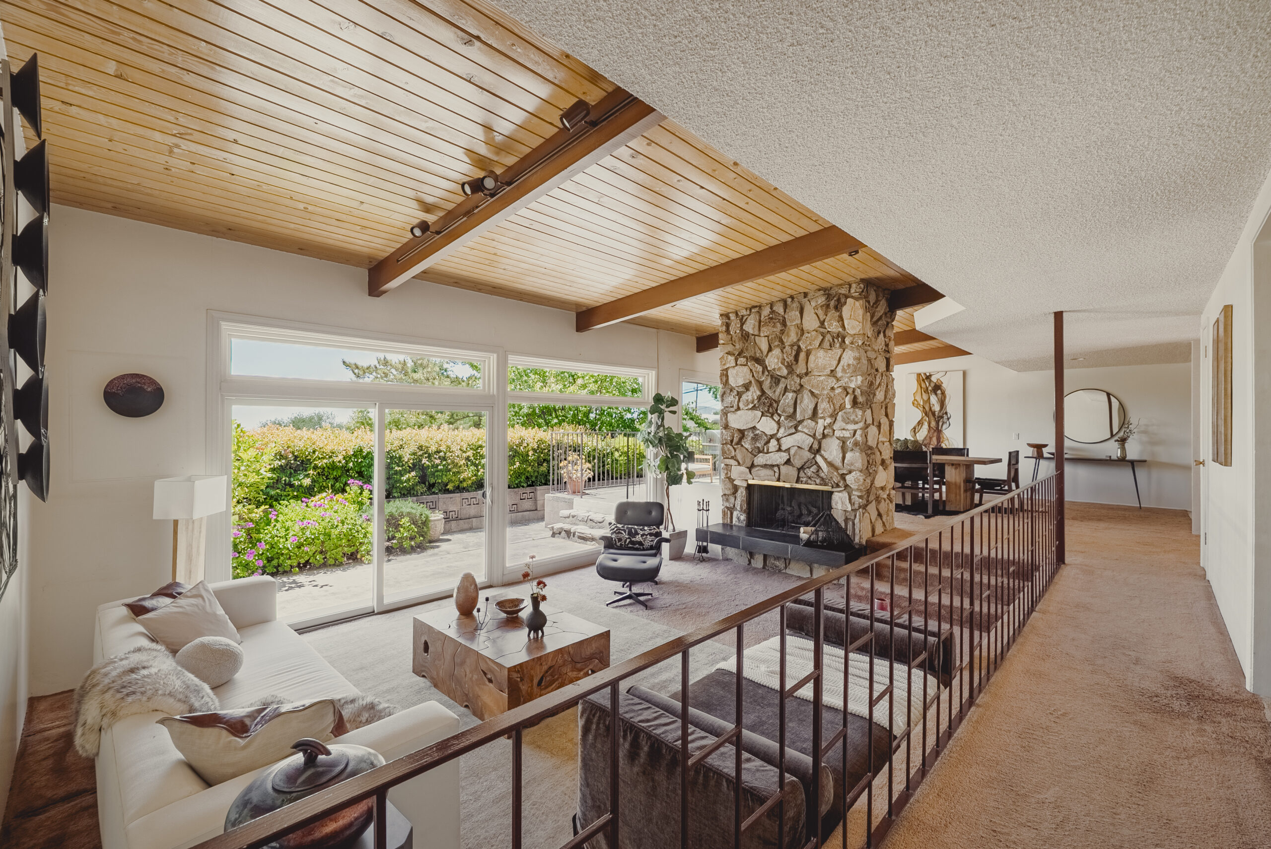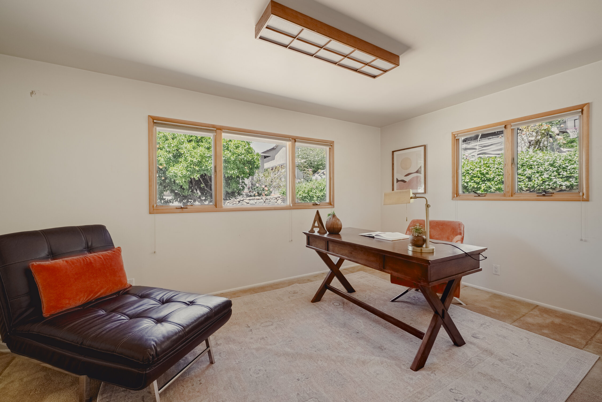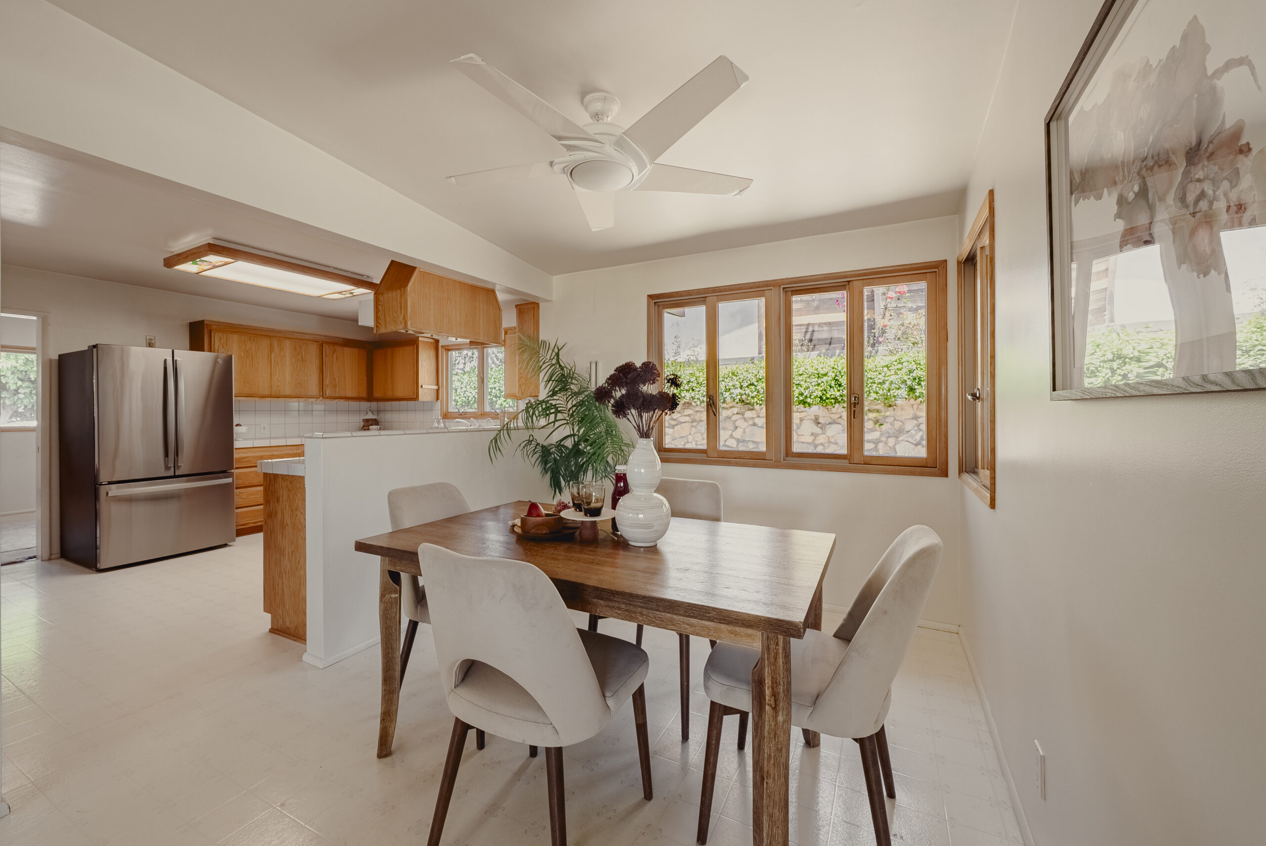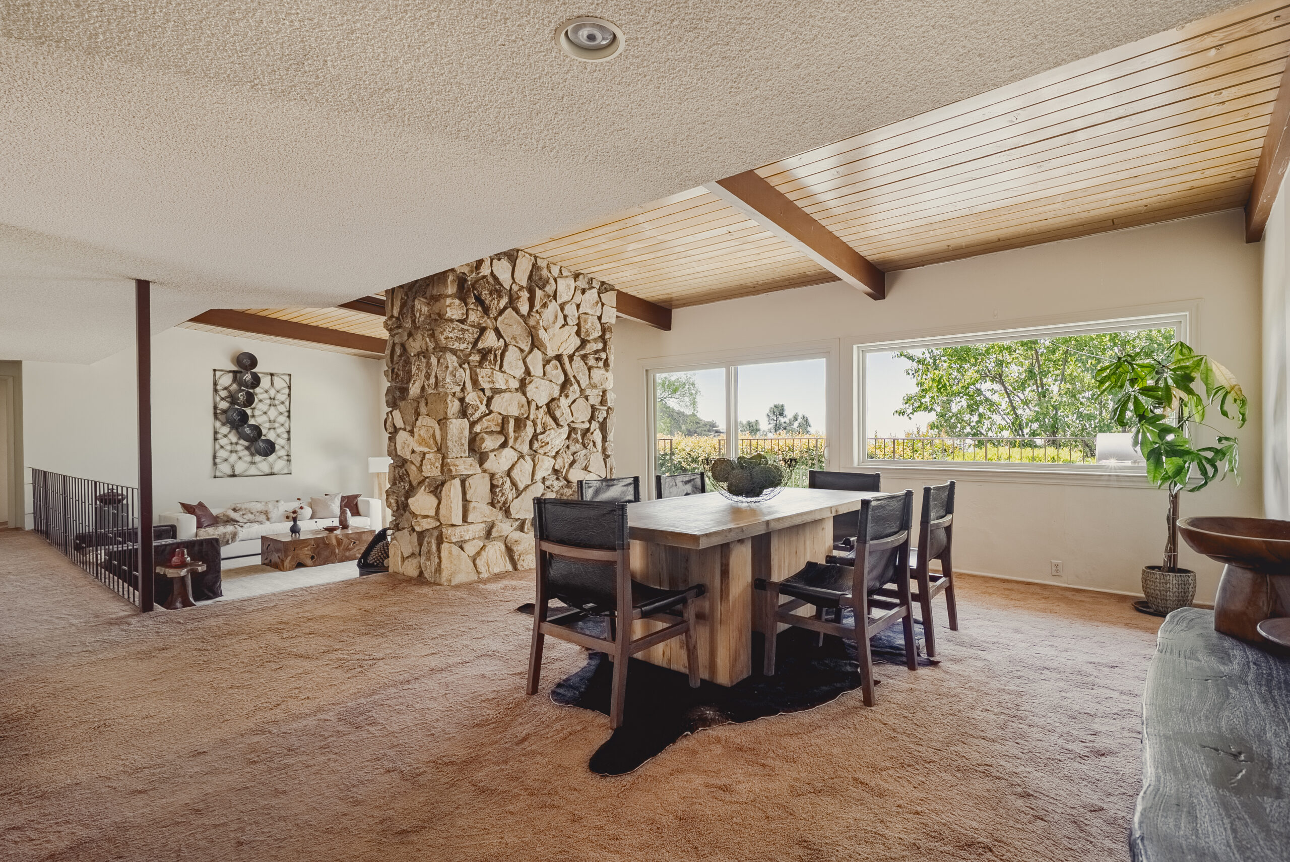 Step inside to just over 2,100 square feet of living space featuring three bedrooms plus a versatile office or potential fourth bedroom. A step-down living room adds a dash of mid-century modern charm, while vaulted, open-beam ceilings in both the living and dining rooms enhance the sense of light and airiness. The expanded kitchen offers a great connection to the breakfast area and flows seamlessly into the home’s main living spaces—perfect for entertaining or everyday comfort.