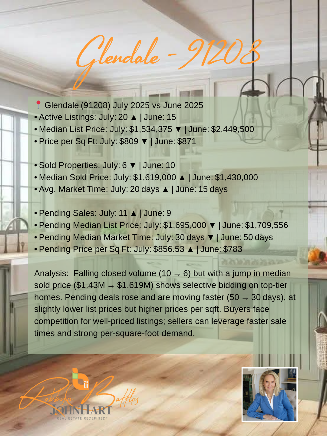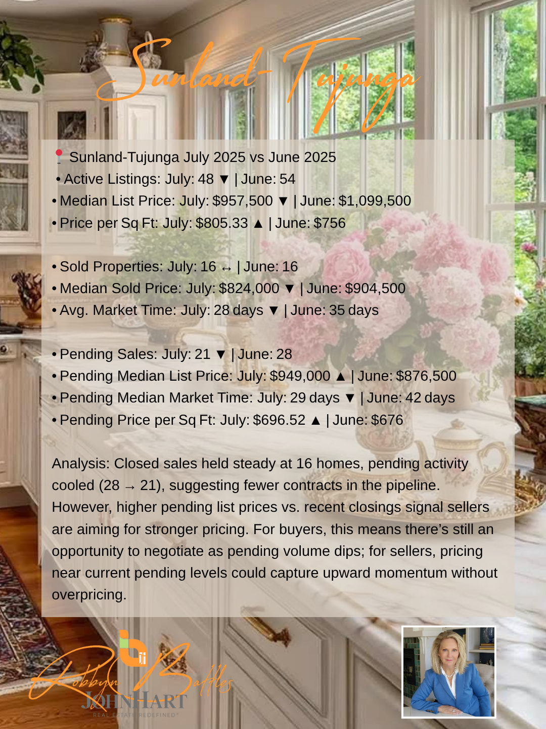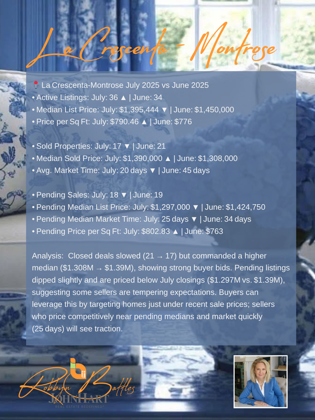 In this July 2025 Market at a Glance, Robbyn Battles compares June 2025 vs. July 2025 data for five key Foothill communities—Sunland Tujunga, La Crescenta‑Montrose, La Cañada Flintridge, Shadow Hills, and Glendale (91208). Understanding this month‑to‑month market comparison is essential whether you’re a buyer hunting for value, a seller timing your listing, or a homeowner tracking local home‐price trends and affordability in these sought‐after California suburbs.Overall Foothill Real Estate Trends & Affordability:June 2025 vs. July 2025 shows overall active listings increasing by about 8%, giving buyers more options and slightly easing upward price pressure. Price per square foot remains stable or rising in most areas, highlighting continued buyer demand. Entry‑level pockets like Shadow Hills are showing improved affordability, while luxury markets such as La Cañada Flintridge maintain premium pricing. Across the board, homes under contract are moving faster—often under 30 days—indicating strong competition for well‑priced listings.