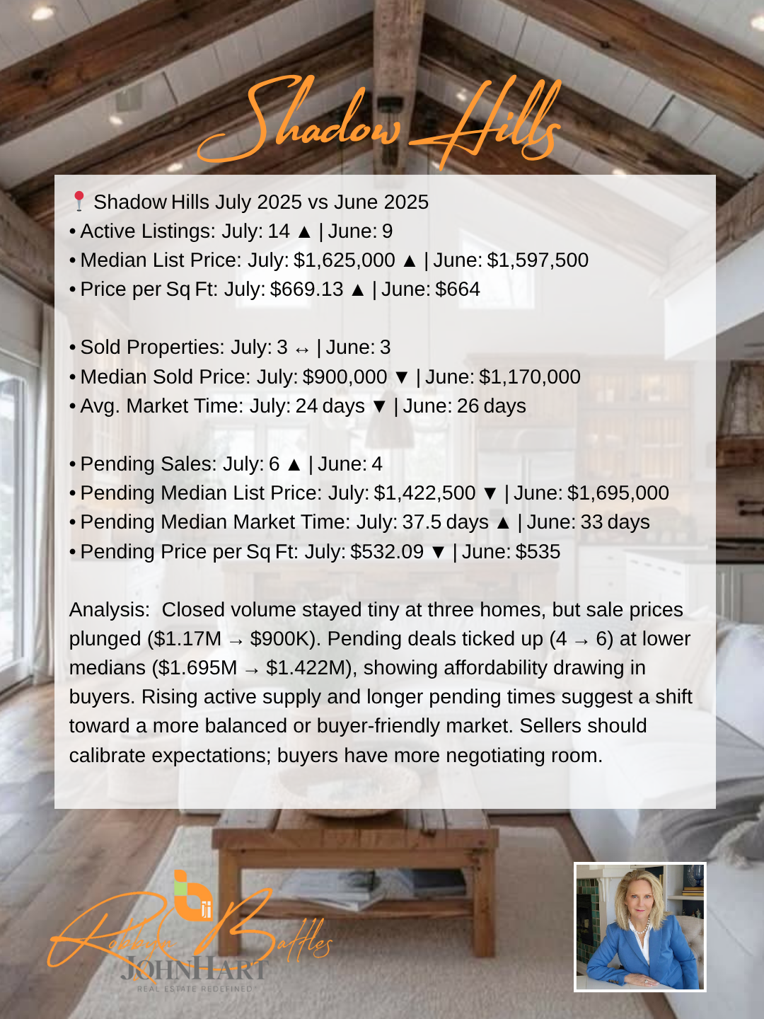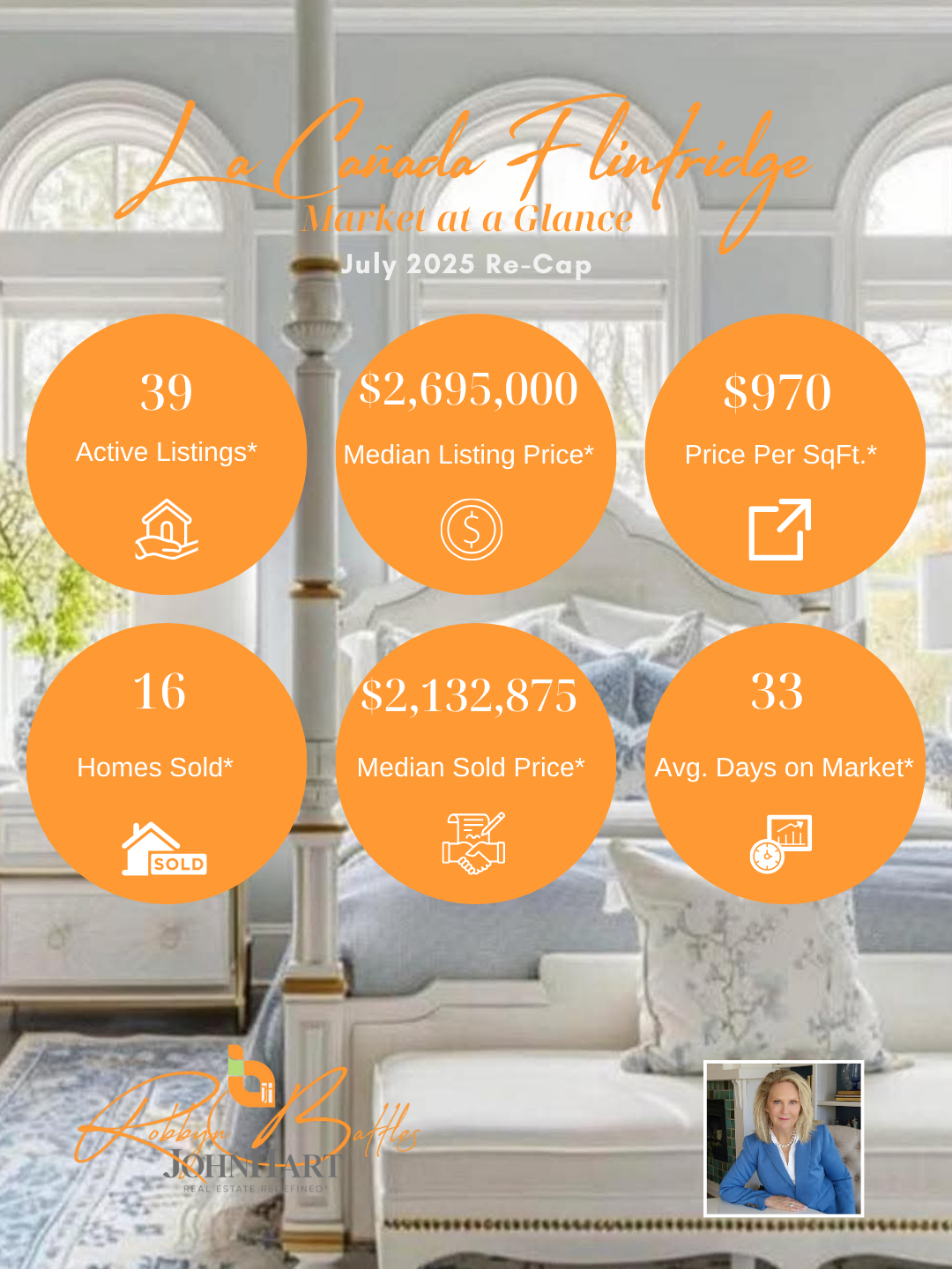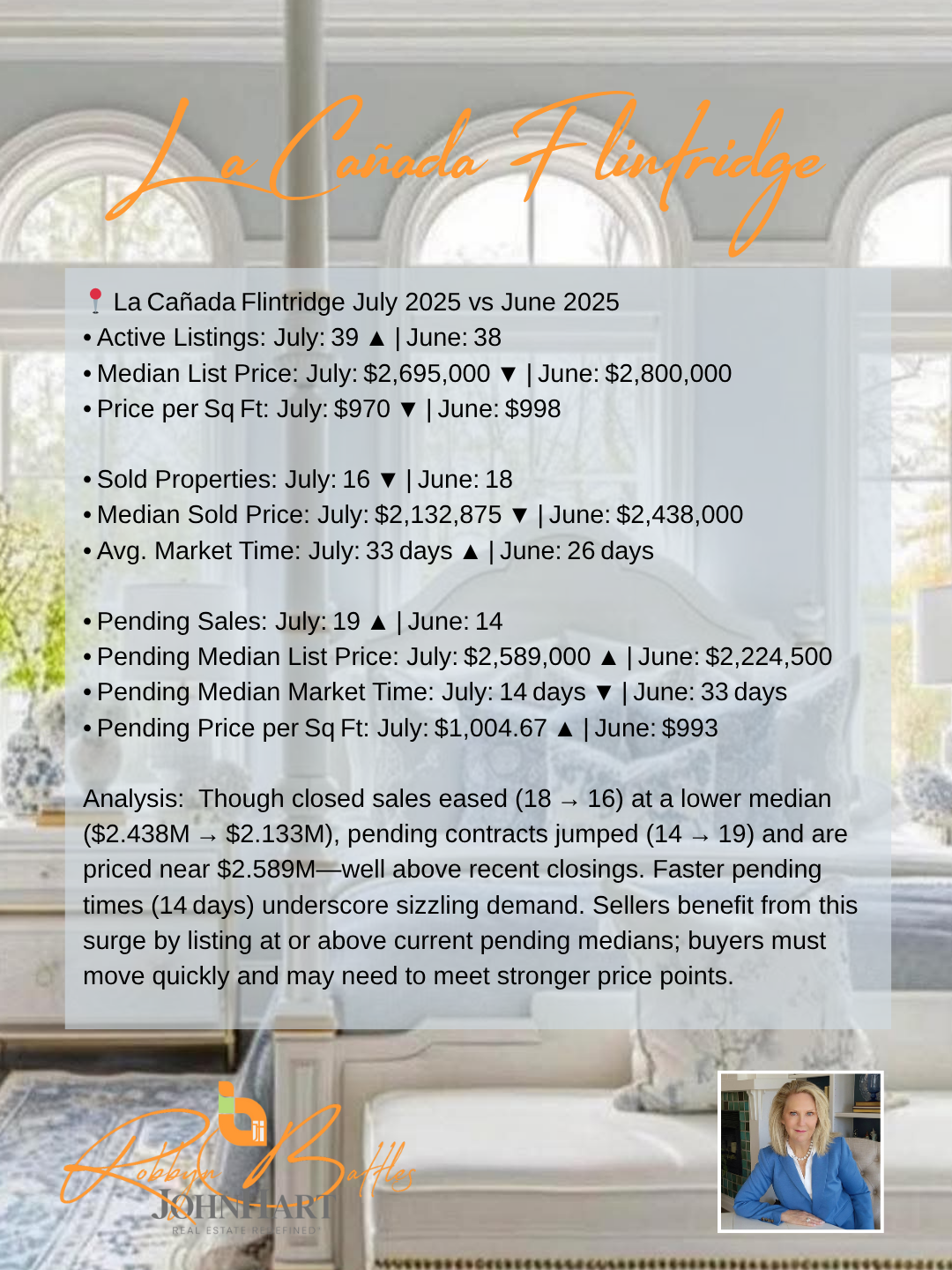 In this July 2025 Market at a Glance, Robbyn Battles compares June 2025 vs. July 2025 data for five key Foothill communities—Sunland Tujunga, La Crescenta‑Montrose, La Cañada Flintridge, Shadow Hills, and Glendale (91208). Understanding this month‑to‑month market comparison is essential whether you’re a buyer hunting for value, a seller timing your listing, or a homeowner tracking local home‐price trends and affordability in these sought‐after California suburbs.Overall Foothill Real Estate Trends & Affordability:June 2025 vs. July 2025 shows overall active listings increasing by about 8%, giving buyers more options and slightly easing upward price pressure. Price per square foot remains stable or rising in most areas, highlighting continued buyer demand. Entry‑level pockets like Shadow Hills are showing improved affordability, while luxury markets such as La Cañada Flintridge maintain premium pricing. Across the board, homes under contract are moving faster—often under 30 days—indicating strong competition for well‑priced listings.