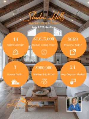 With sprawling ranches and lower price points, Shadow Hills offers relative affordability in the Foothills. Active listings surged 56% (9 → 14), while median sold price fell from $1.17 M to $900 K—an indicator that more buyers are seeking value in this rural‑character community. Pending deals increased (4 → 6) at a median of $1.422 M, demonstrating growing interest from those prioritizing acreage and equestrian amenities. Longer average pending times (37 days) suggest buyers have more negotiation leverage. Sellers should be realistic about pricing and consider small improvements—like landscaping or interior refreshes—to stand out in this emerging buyer‑friendly market.