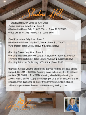 This luxury enclave boasts estate‑sized lots, award‑winning schools, and sweeping valley views. Pending sales jumped 36% (14 → 19) with median pending list price near $2.59 M—well above June’s $2.24 M median closing—showing buyers remain willing to pay for prestige and privacy. Despite a slight dip in closed sales (18 → 16) and sold price easing from $2.438 M to $2.133 M, contracts are now ratified in just 14 days. Key drivers include a well maintained City, boutique retail on Foothill Boulevard, and equestrian zoning. Sellers can leverage strong demand and buyers must act decisively and expect stiff competition on premium properties.Shadow Hills Market Update: