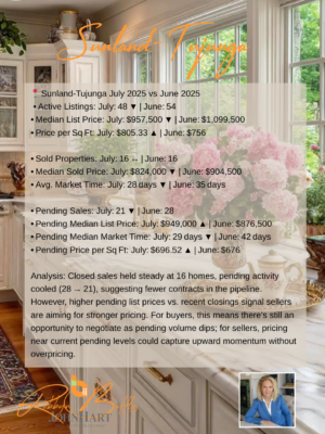 As a Broker Associate with JohnHart Real Estate with over 35 years ecperience, I’ve guided clients through every market cycle in Sunland Tujunga, La Crescenta‑Montrose, La Cañada Flintridge, Shadow Hills, and Glendale (91208). Whether you’re buying, selling, or exploring your options, I’m here to help you navigate these July 2025 market insights with confidence.